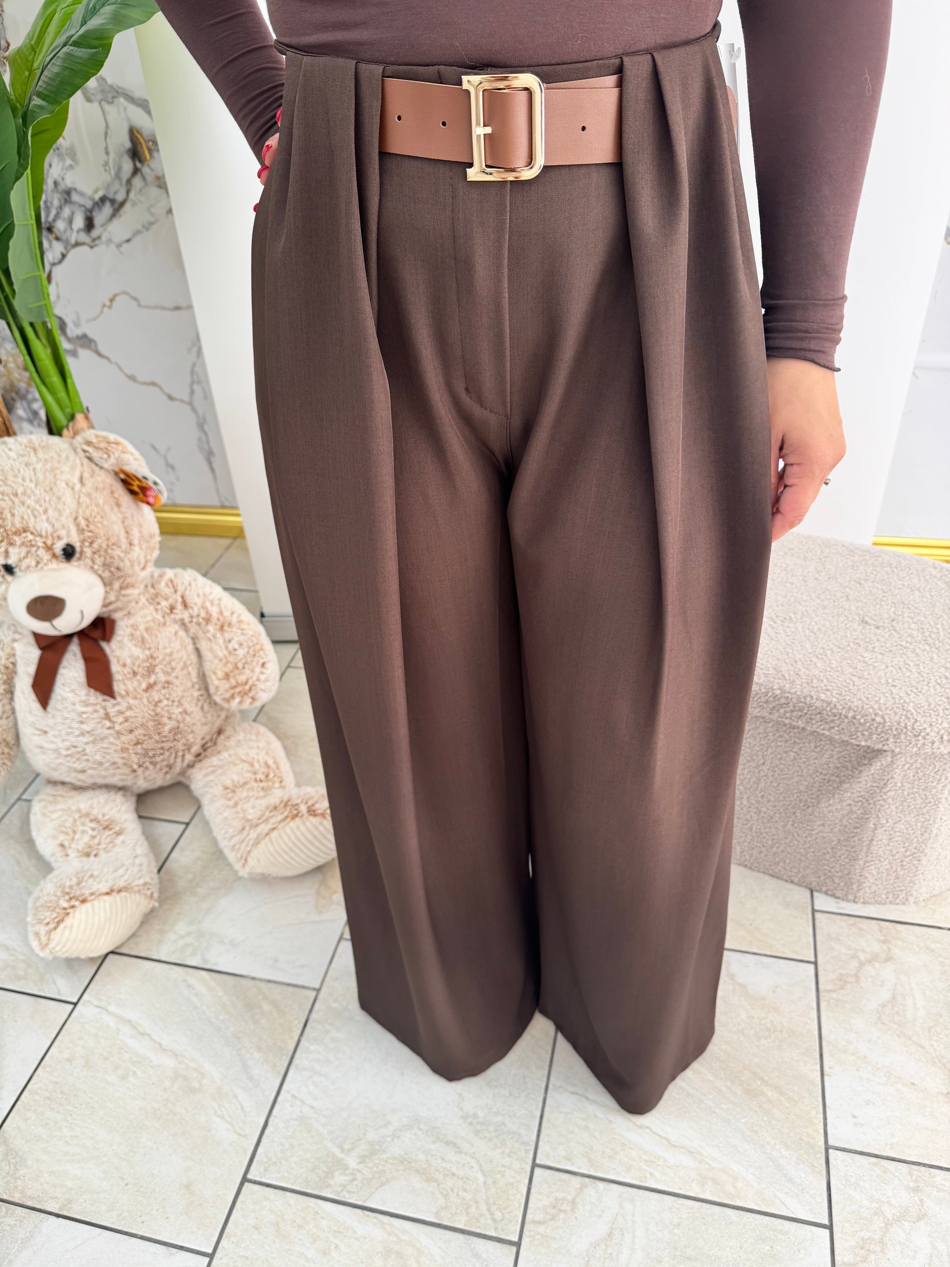 Pantalone palazzo in tonalità marrone, realizzato con tessuto fluido e confortevole che garantisce libertà di movimento. La silhouette ampia e elegante si adatta perfettamente a qualsiasi occasione, dal lavoro agli eventi serali. Completo di cintura coordinata per definire la vita e completare lo stile. Ideale per chi ricerca un capo versatile che unisce comodità e raffinatezza, perfetto da abbinare con top minimali o bluse strutturate.